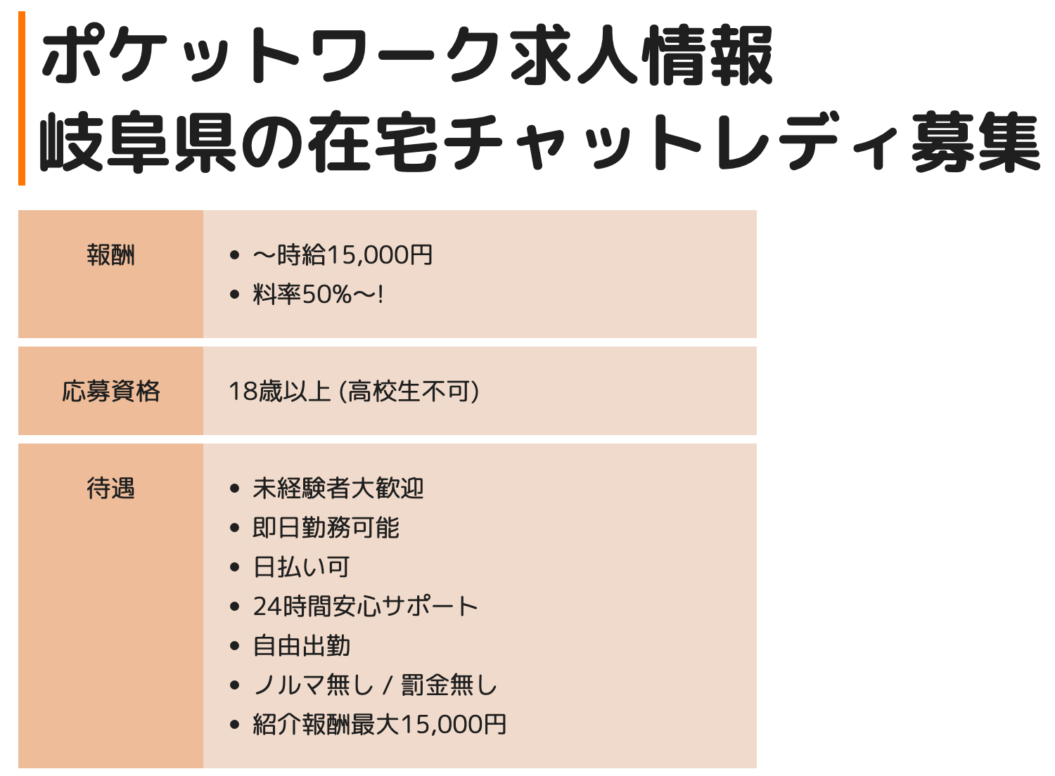 ポケットワークは、在宅チャットレディの定番とも言える大手チャットレディ事務所で、岐阜在住の女性も在宅で登録・活動できます。