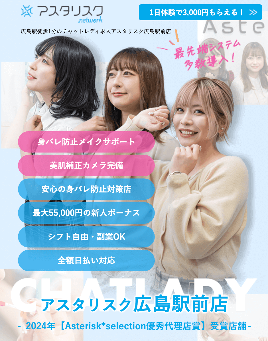 広島には通勤・在宅どちらでも働けるチャットレディ事務所が複数あり、初心者でも高収入を目指せる求人が多くあります。