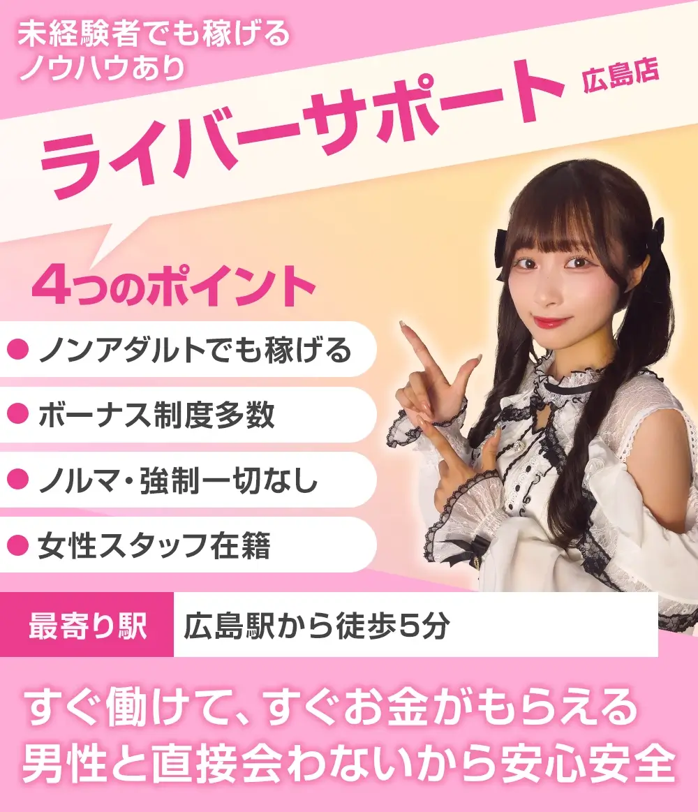 ライバーサポートグループ広島店は、初心者でも働きやすいサポート体制が整っている大手チャットレディ事務所です。