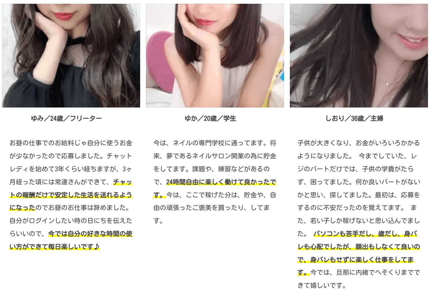 副業として登録しました。完全個室のチャットルームで身バレ対策もしっかりしているので安心して働けます。週2〜3回ログインして月10万〜12万円くらいのお小遣いになっています。