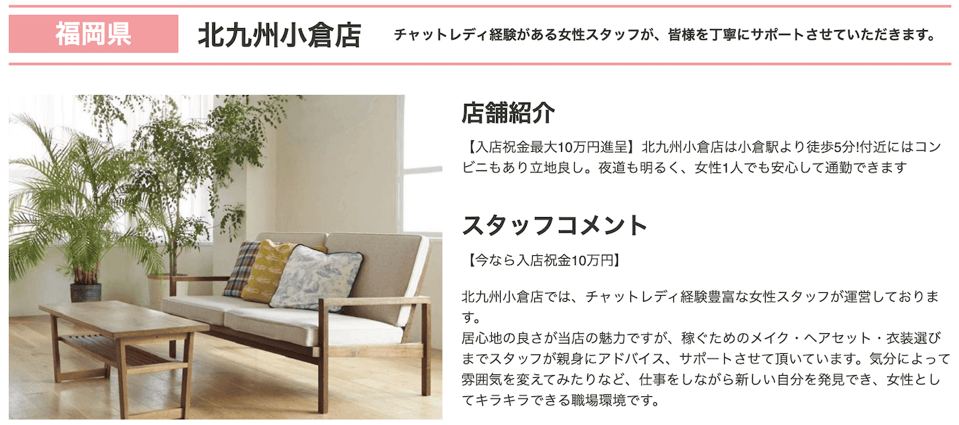 小倉で「まずは無理なくチャトレを始めたい」という人にはかなり向いている事務所です。
