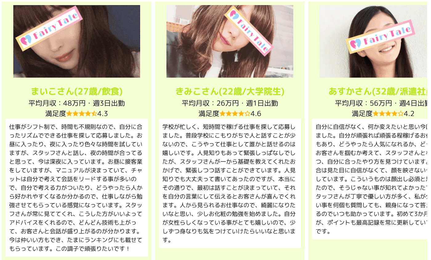 一人暮らしの生活費を補うために始めました。最初は不安でしたが、面接で仕事内容や稼ぎ方を丁寧に説明してくれたので安心でした。最初は月12万円くらいでしたが、今は月18万〜22万円くらい稼げています。