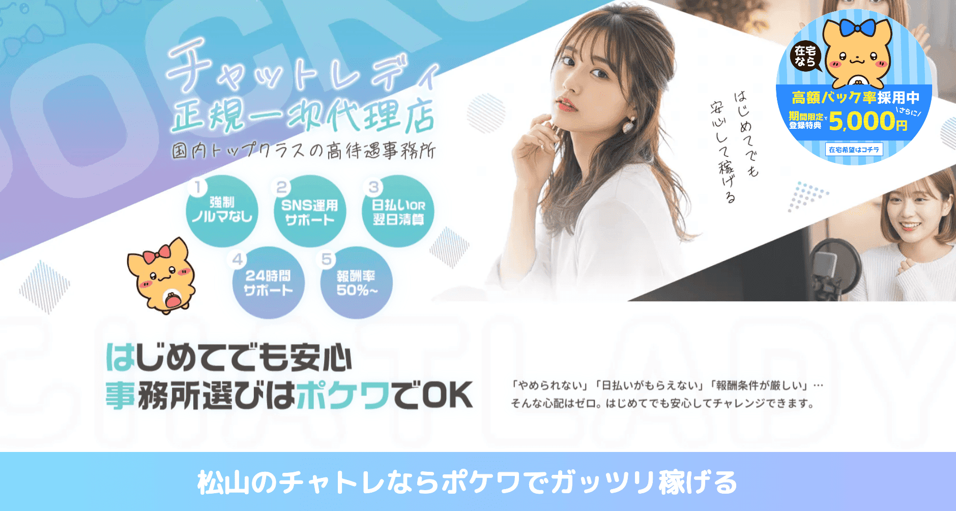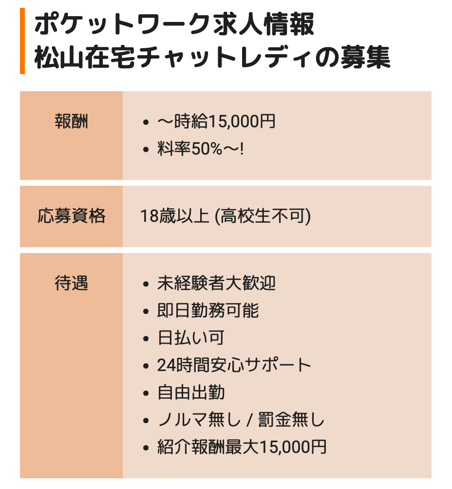 松山の在宅チャットレディ求人では、報酬率50%以上、翌日日払い可能、女性スタッフ対応、24時間LINE相談OKなど充実のサポート体制が用意されています。