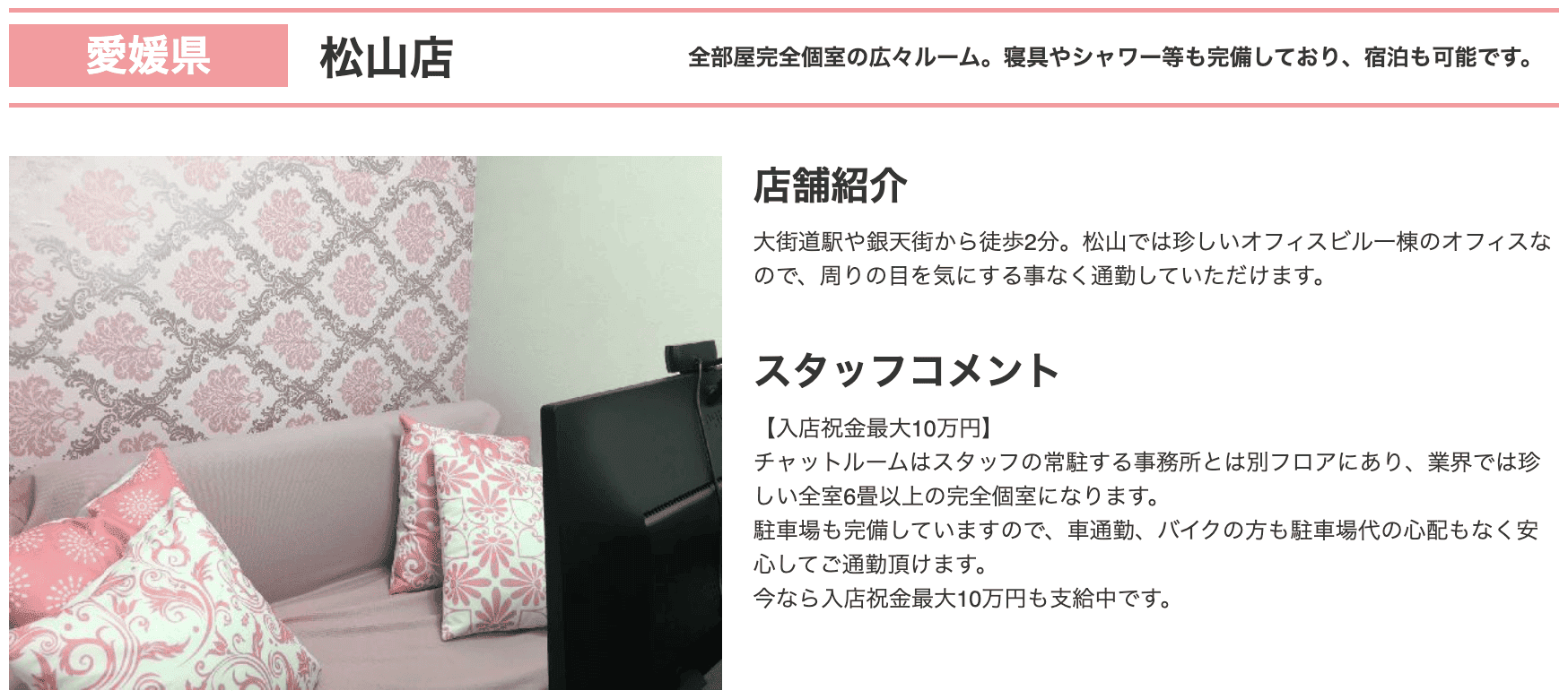愛媛松山店は警察署前駅から徒歩7分、勝山町駅から徒歩10分の場所にあり、女性スタッフ中心のサポートや日払い対応などから人気となっています。