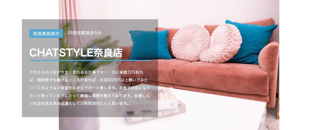 CHATSTYLE奈良店は、初心者でも始めやすいバランス型の事務所です。サポートと働きやすさのバランスが良く、「これからチャットレディを始めたい」という人に向いています。