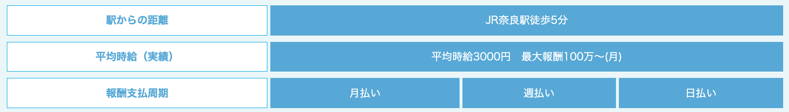奈良店の実績としては平均時給3,000円、最高月収100万円以上なので、高時給を目指したい人におすすめですね。