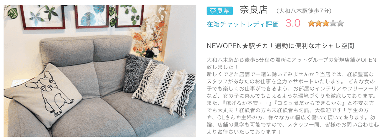 アリアチャット奈良店は、サポート重視で選びたい人に向いている事務所です。全国展開しているグループで、未経験からでも収入を伸ばしやすい体制が整っています。