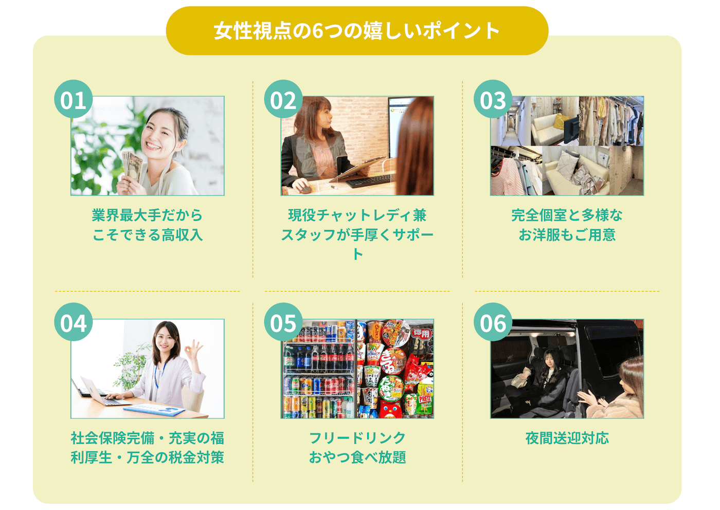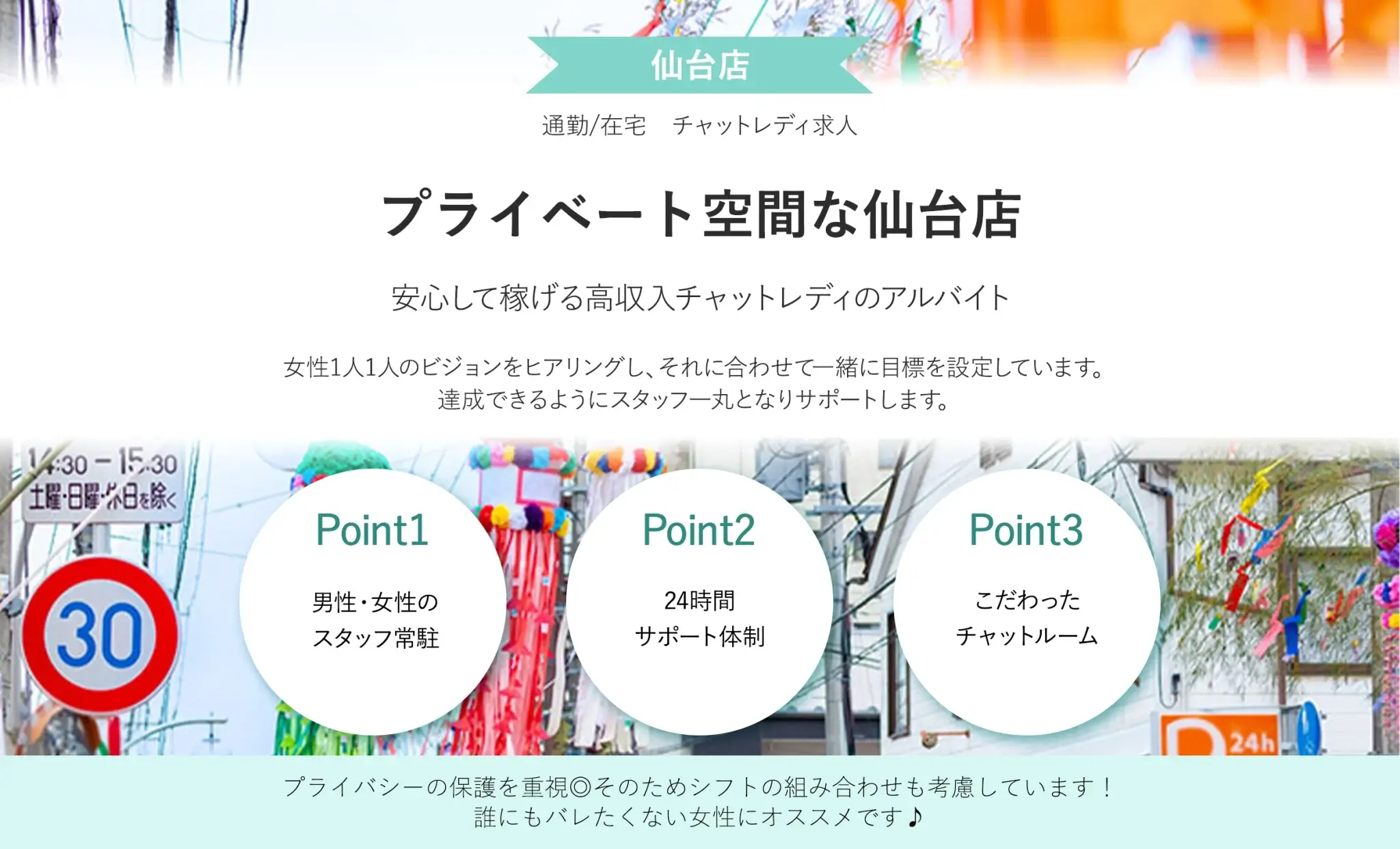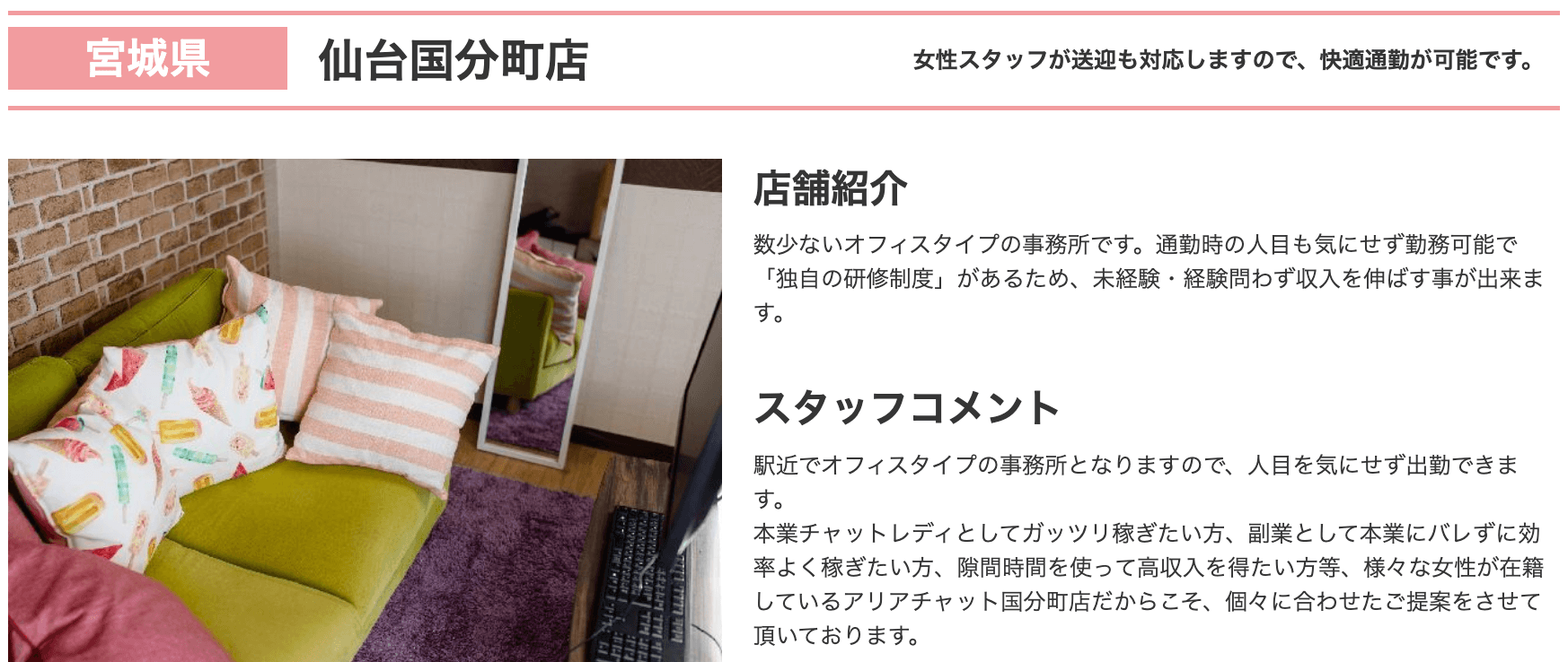 仙台店では女性向けの高待遇が用意されており、高い報酬率とチャットレディ経験者スタッフによる丁寧なサポート、社会保険や税金サポートから夜間送迎まで手厚い環境を用意しています。