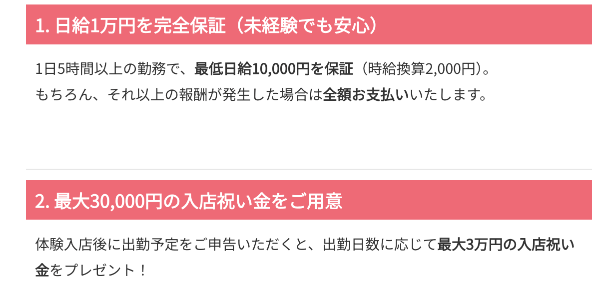 | 福利厚生 | 日払い対応、面接交通費支給、衣装レンタル、税務サポート |