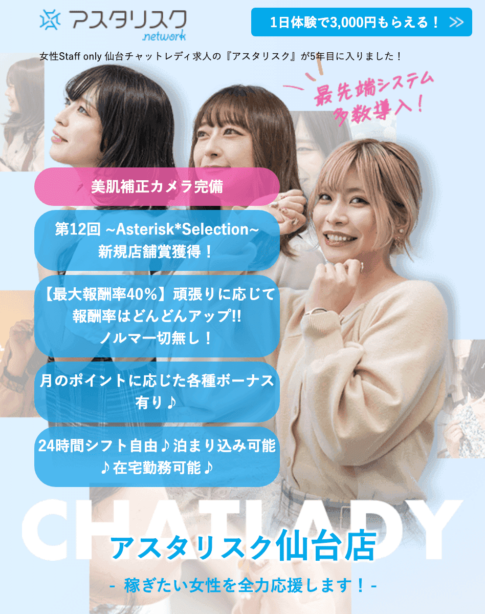 アスタリスクは、女性スタッフによる丁寧なサポート体制と高い報酬率で人気の大手チャットレディ事務所です。