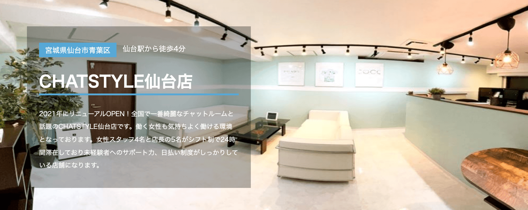 仙台店では仙台駅から徒歩5分の抜群のアクセスに加えて、チャットレディ経験者のスタッフが丁寧にアドバイスしてくれるので、チャトレ未経験者でもすぐに成長できる環境です。