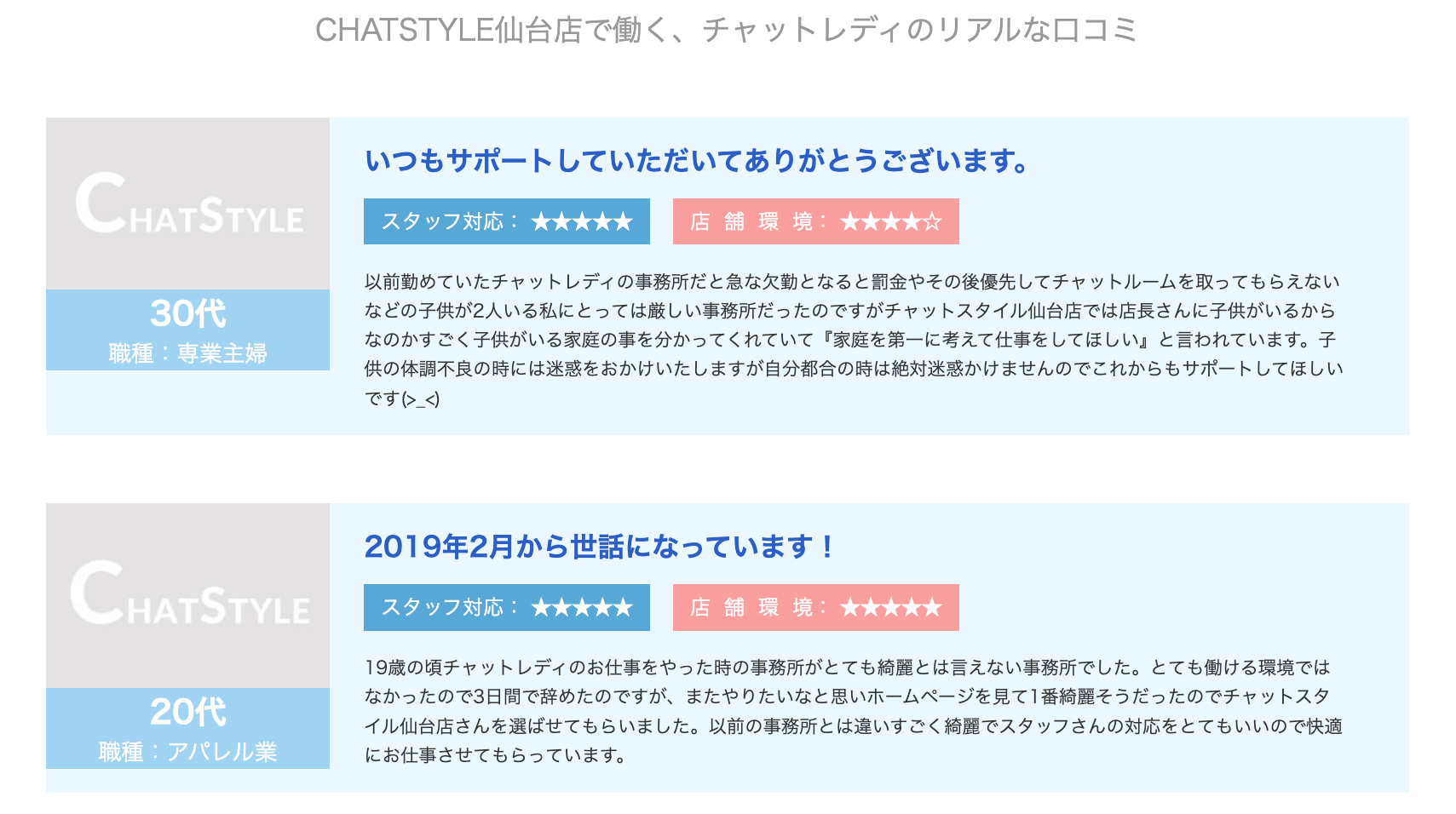実際にCHATSTYLE仙台店のチャットレディは、所属先を高く評価している口コミも多く、働きやすい環境であることがわかりますね。