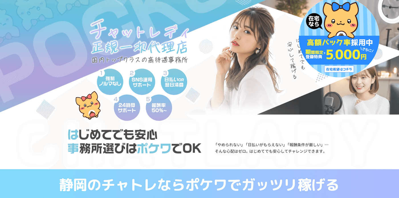 ポケットワーク静岡は、在宅でチャットレディをしたい人に圧倒的に人気のある大手事務所です。自宅で自由に働けるため、静岡市内はもちろん、周辺エリアから登録している女性も多くいます。