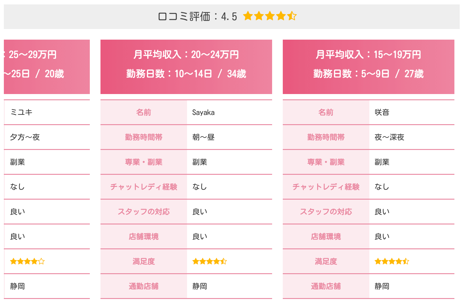 週1-2回勤務して月収15万円以上稼ぐ方もいるので、「静岡のチャトレでガッツリ稼ぎたい」という人にこそおすすめですね。