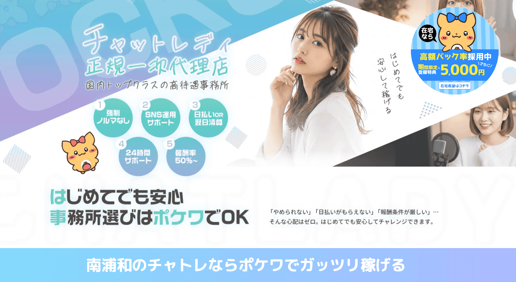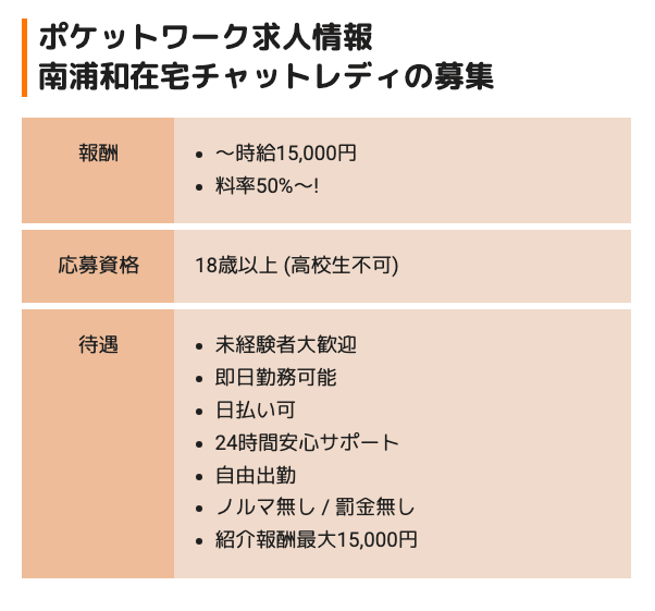 ポケットワーク南浦和は、在宅でしっかり稼ぎたい人向けの大手チャットレディ事務所です。浦和や南浦和周辺に住んでいて、移動時間をかけずに働きたい人には選ばれています。