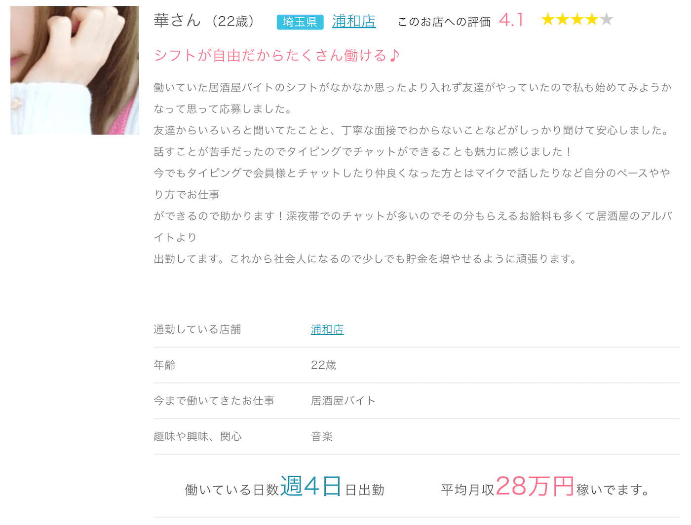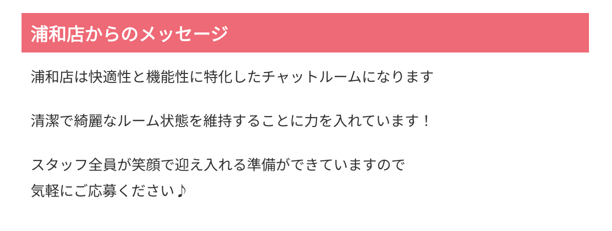 浦和店は、雰囲気が良くて働きやすいという点が強み。チャットレディは報酬面ばかり見られがちですが、実際には「相談しやすいか」「無理なく続けられるか」もかなり大事です。